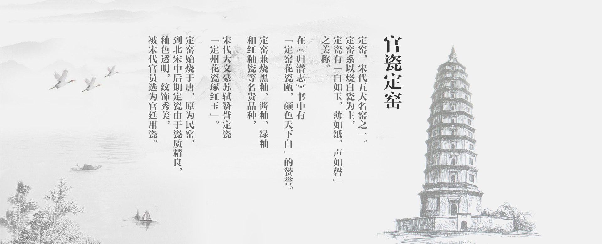 定州市官定瓷業(yè)有限公司,位于“定瓷文化發(fā)祥地”——定州,其前身是官瓷定窯文化交流中心,成立于2013年,官定瓷業(yè)是一家集定窯文化推廣,定瓷生產(chǎn)、科研的市級(jí)重點(diǎn)龍頭企業(yè),主要經(jīng)營(yíng)定瓷茶具、餐具,定瓷工藝品等。 官定瓷業(yè)秉承傳統(tǒng)燒制工藝?yán)砟睿钔谒未爸拼伞奔妓嚲瑁瑥钠魅氲纴砩A茶人精神境界,“器”只是個(gè)載體,通過器能給茶人帶來“正、清、和、雅”的禪意生活。 我們本著誠(chéng)信做人,踏實(shí)做事的查看詳情